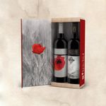 Gift Pack com uma garrafa de Adega Mayor Reserva Tinto 2022 e uma garrafa de Adega Mayor Seleção Bio 2022. Caixa de madeira personalizada com imagem inspiracional papoila.
